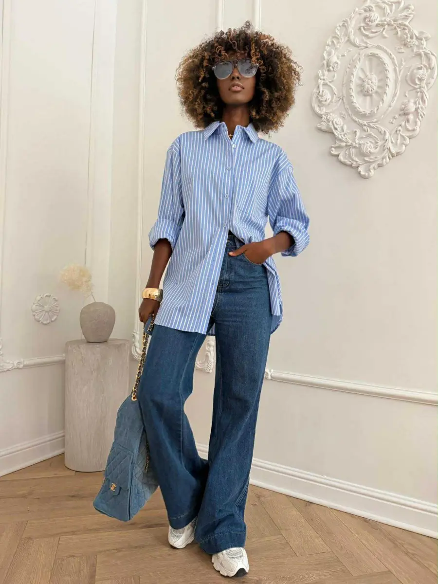 Stilingi dryžuoti marškiniai, lengvai derinami prie įvairių drabužių. Universalus pasirinkimas, puikiai tinkantis tiek kasdieniam, tiek tvarkingesniam įvaizdžiui.