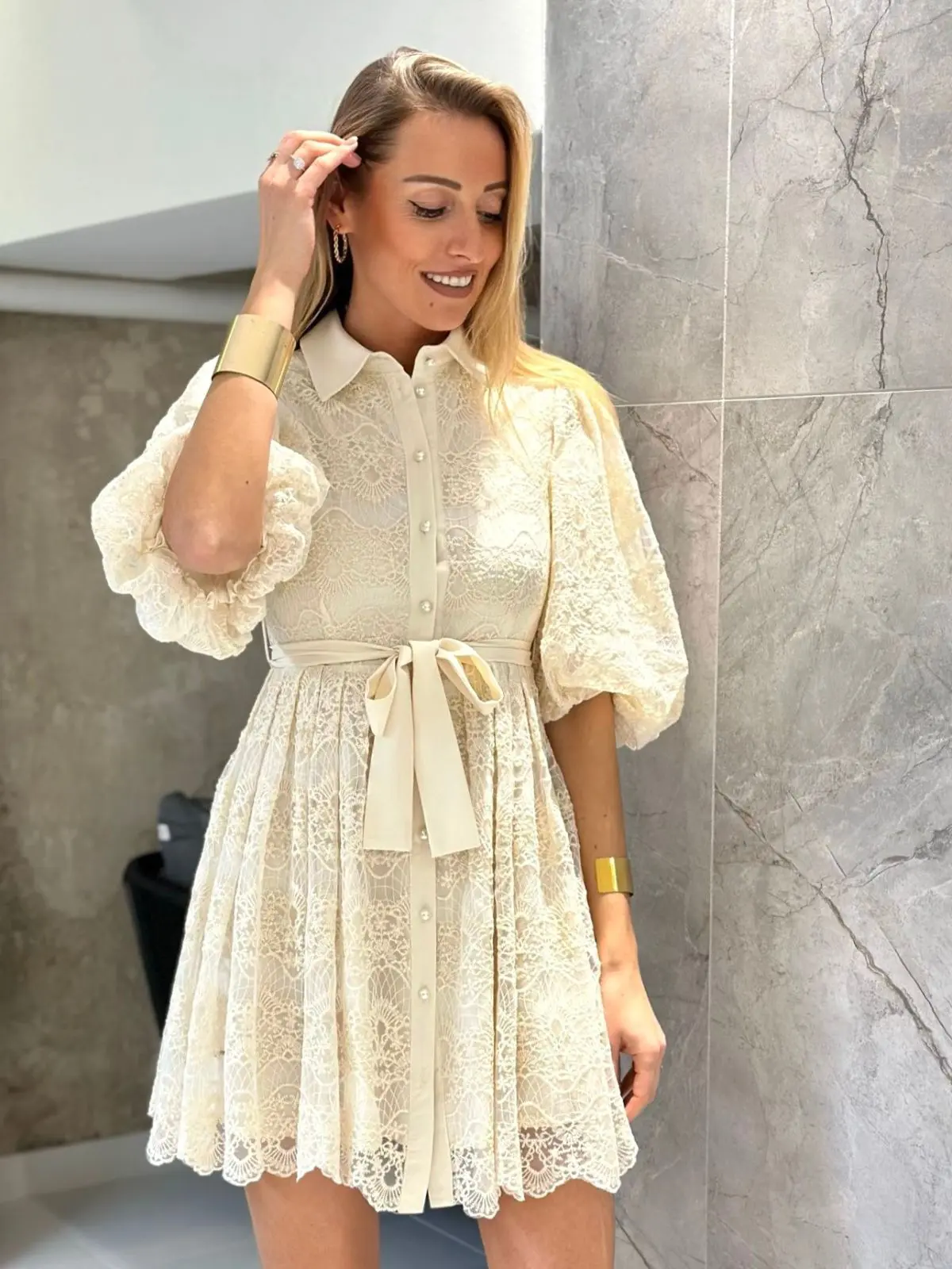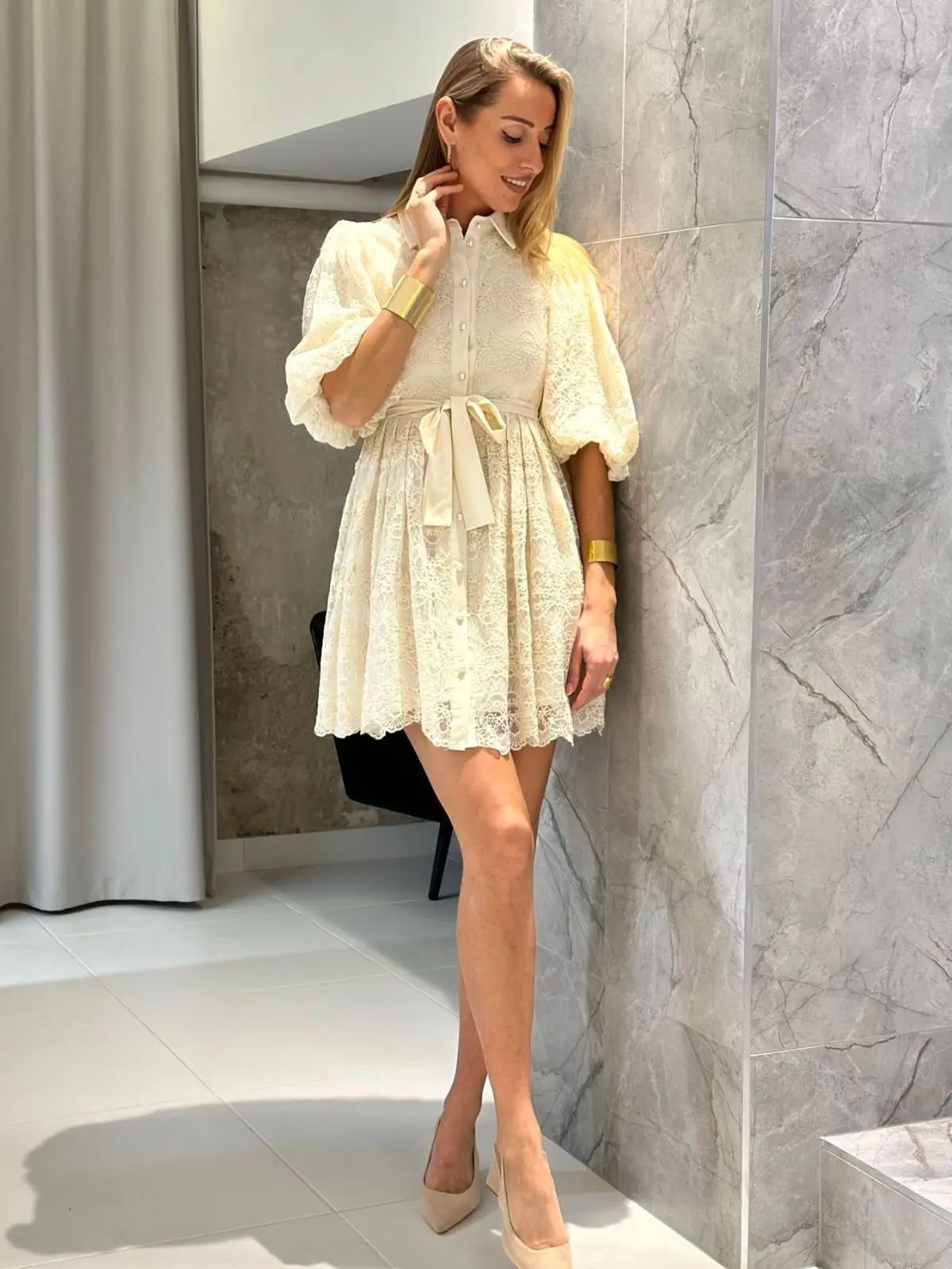 Suknelė pūstomis trumpomis rankovėmis, dekoruota gėlėmis, suteikia romantišką ir moterišką įvaizdį. Lengvas siluetas ir subtilios detalės puikiai tinka šiltojo sezono progoms.