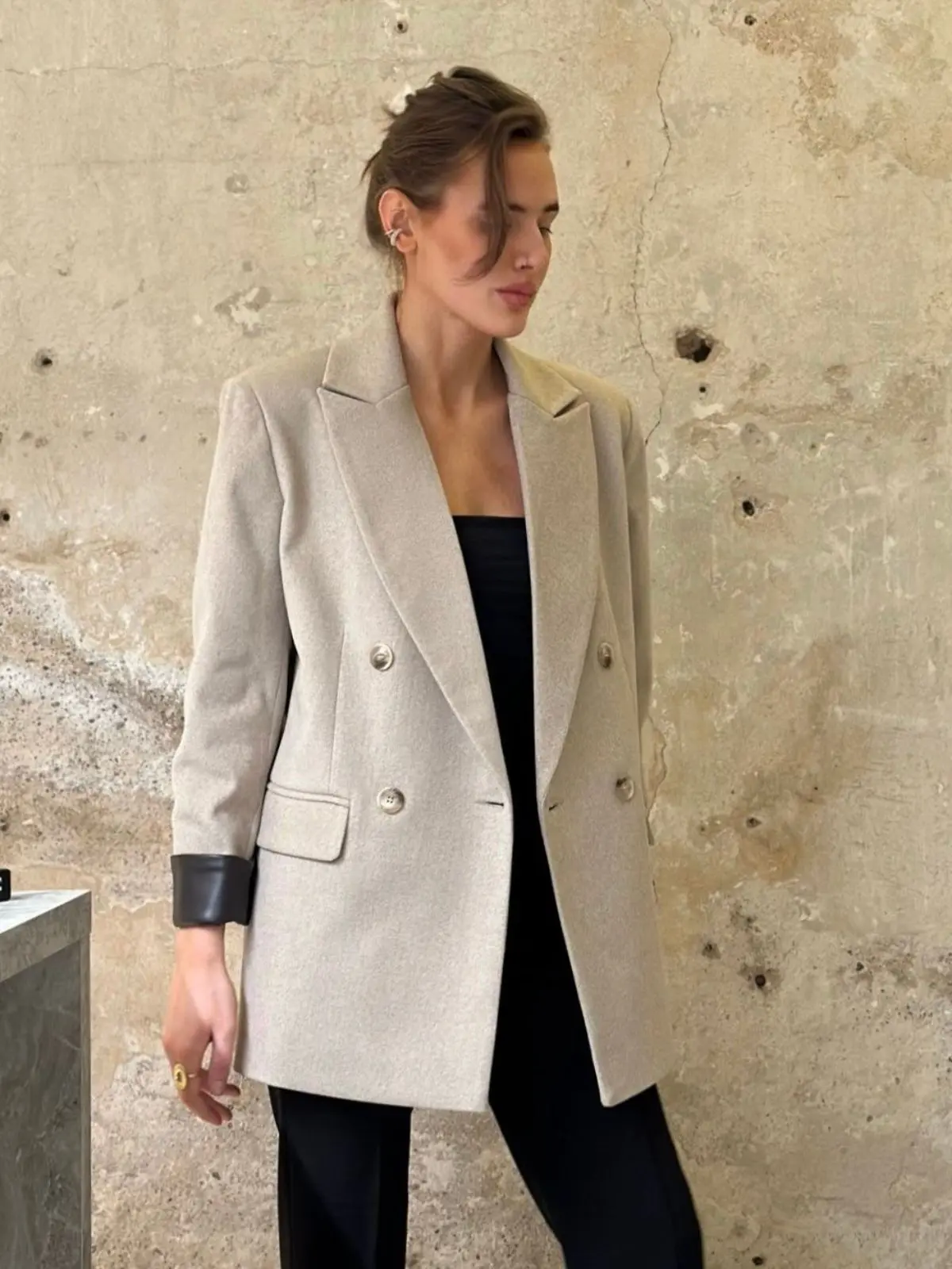 Klasikinis švarkas su dirbtinės odos rankogaliais – elegantiškas ir modernus modelis, suteikiantis įvaizdžiui aštresnio charakterio bei stilingo kontrasto.