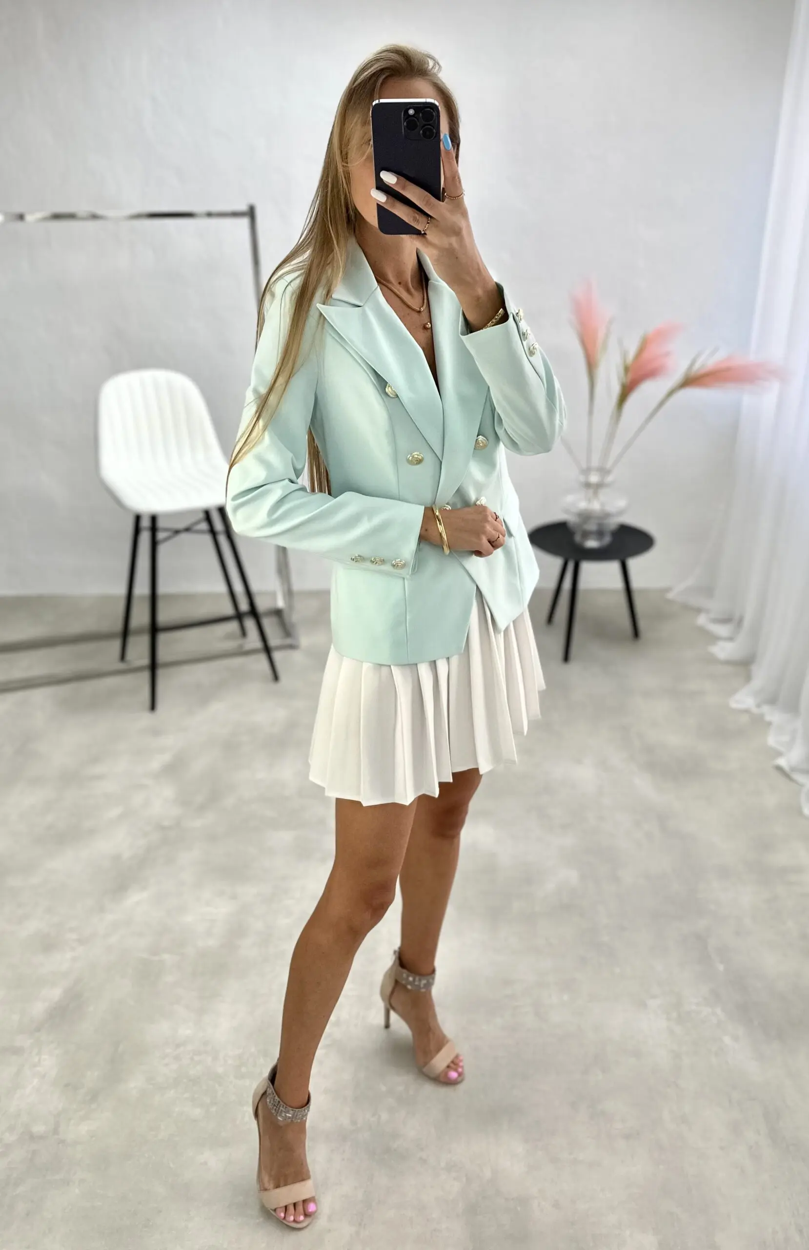 XS dydis: krūtinės apimtis 84 cm, pečių juosta 36,5 cm, rankovės ilgis 60 cm, švarkelio ilgis 59,5 cm
