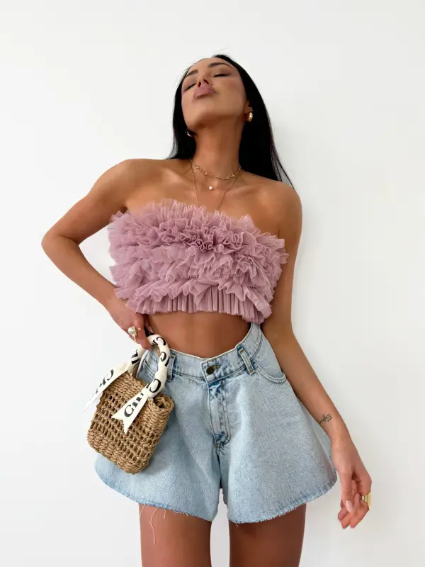 Stilinga tiulio palaidinė „crop top“ modelio – lengvas, akcentas drąsiam ir išskirtiniam įvaizdžiui.