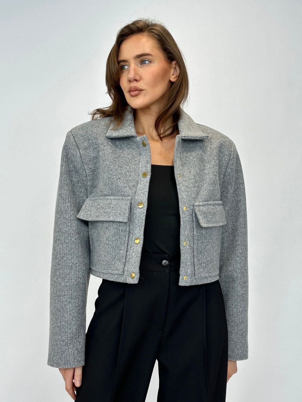 Stilinga trumpa striukė, užsegama kniedėmis, su apykakle ir kišenėmis suteikia modernų ir struktūruotą įvaizdį. Tvarkingas kirpimas ir praktiškos detalės puikiai tinka kasdieniams bei stilingiems deriniams.