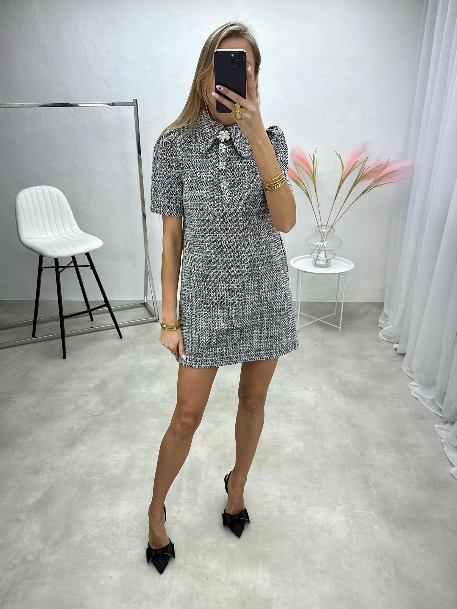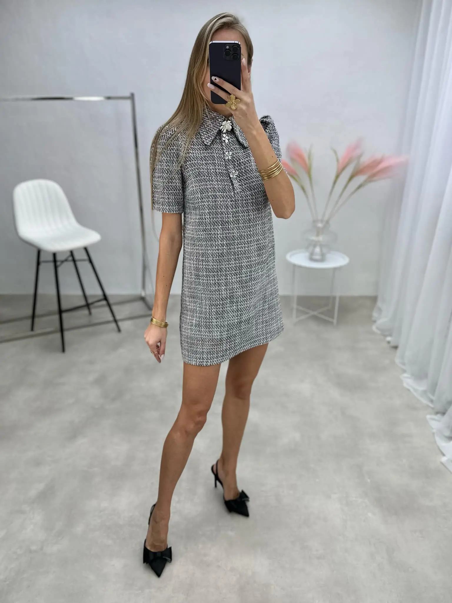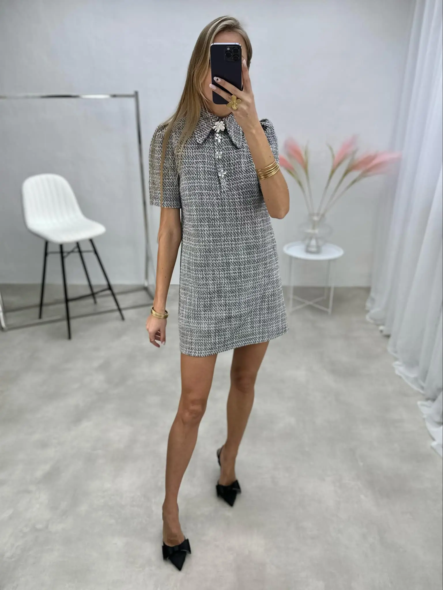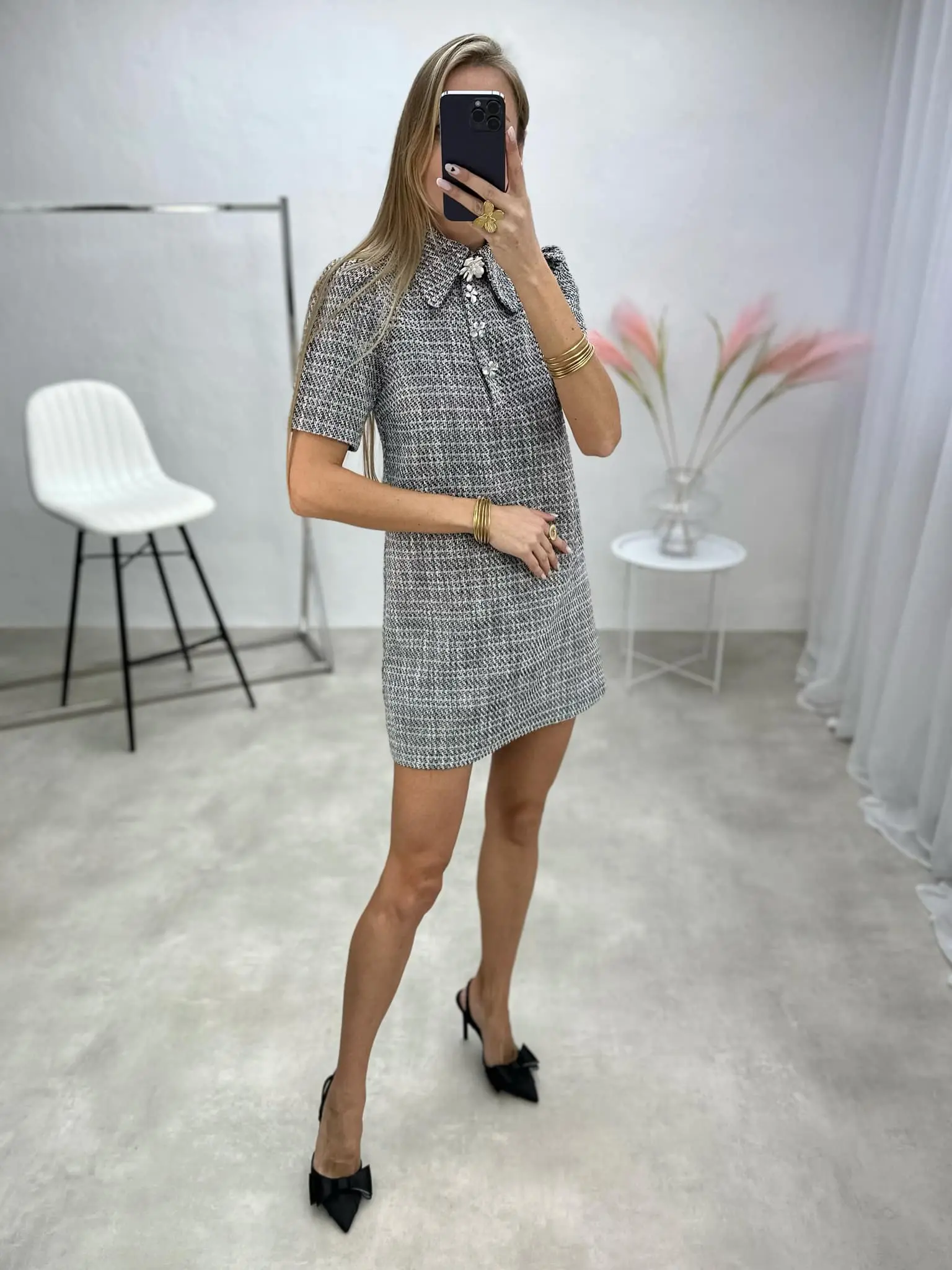 Elegantiška tvido suknelė trumpomis rankovėmis, puošta sidabrinės spalvos detalėmis – subtiliam, išskirtinį skonį atspindinčiam įvaizdžiui.