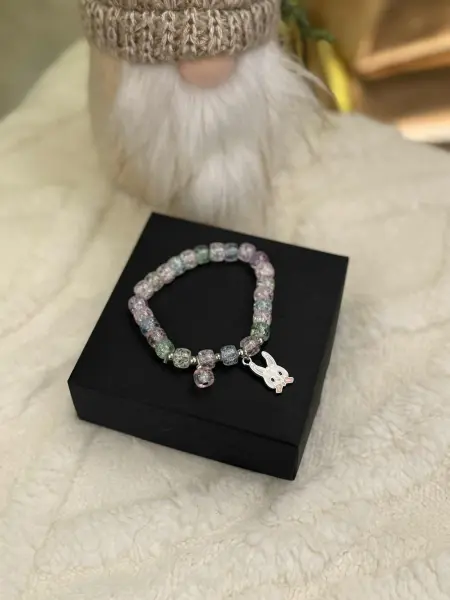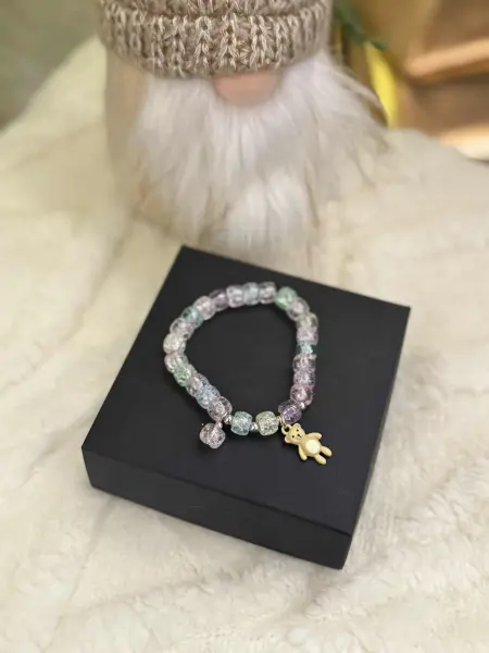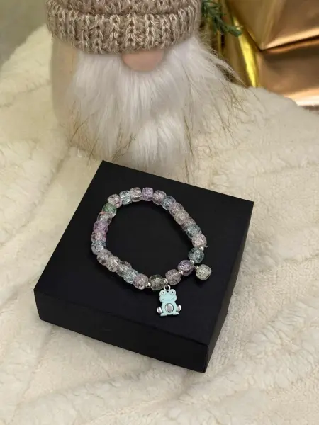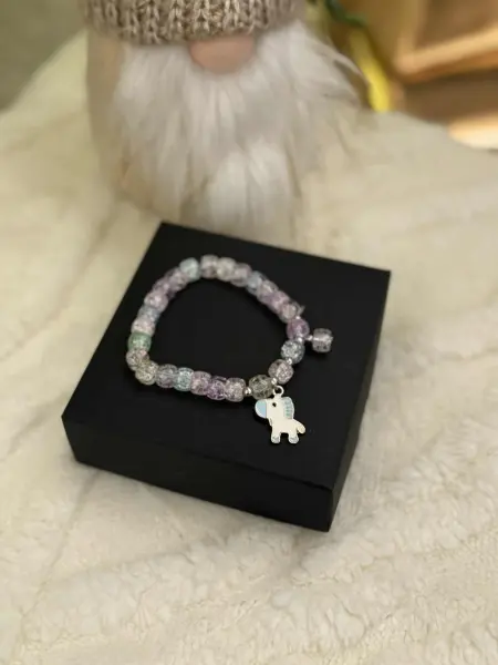 Vaikiška apyrankė iš spalvingų karoliukų, suverta ant tamprios gumos, todėl lengvai prisitaiko prie bet kurios vaiko rankytės. Kiekvieną apyrankę puošia mielas gyvūnėlio formos pakabukas, suteikiantis žaismingumo ir išskirtinumo. Puikus aksesuaras kasdienai arba dovanai!