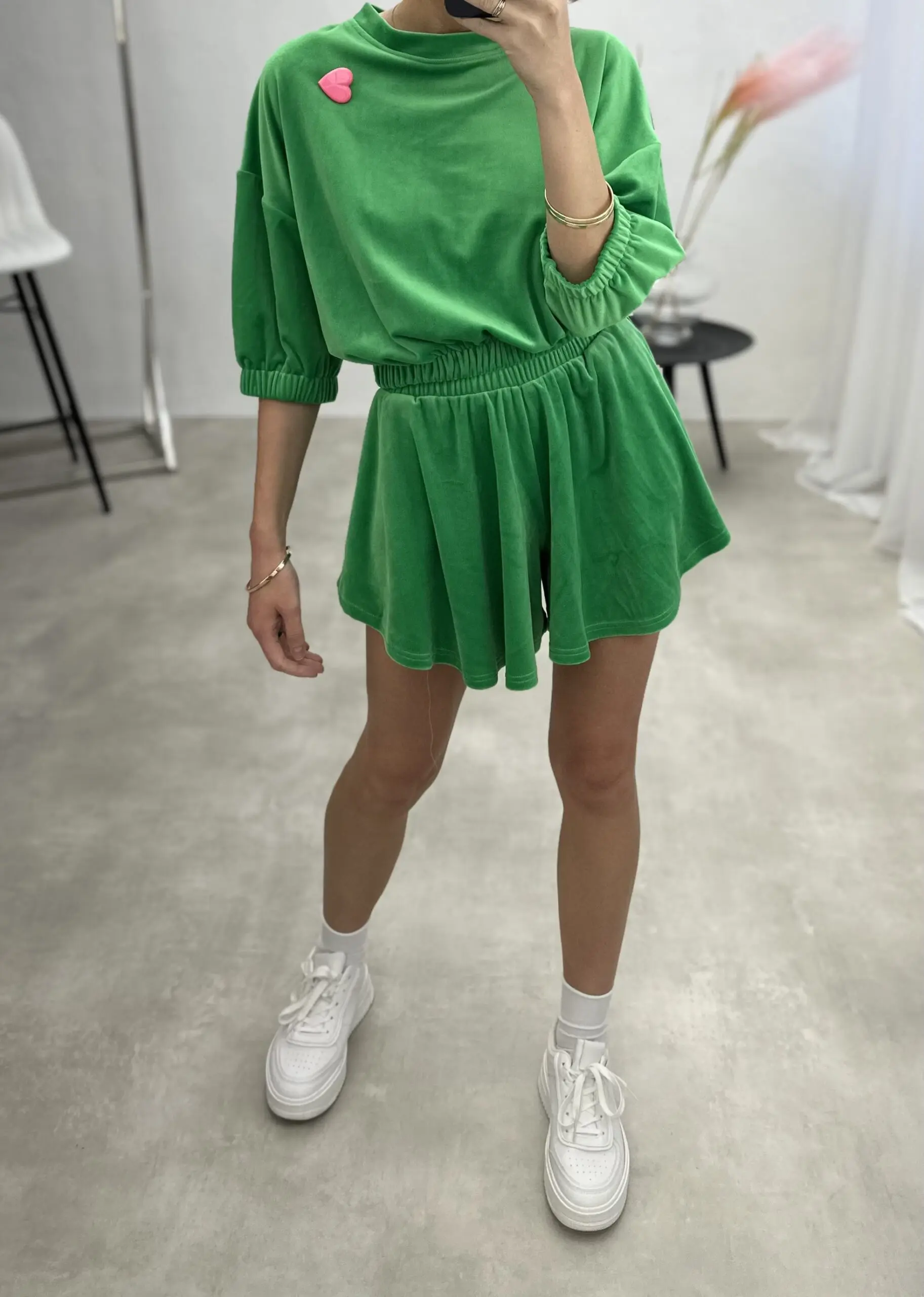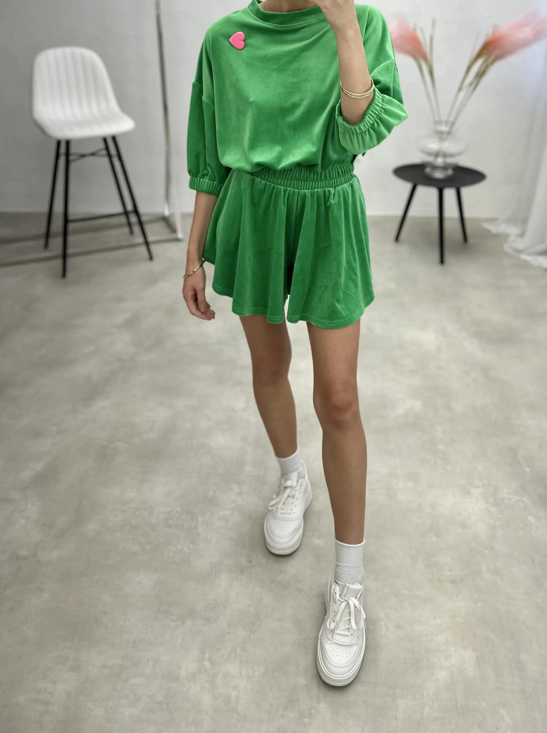 Vasariškas dviejų dalių kostiumėlis, kurį sudaro džemperis ir klostuoto modelio šortai.