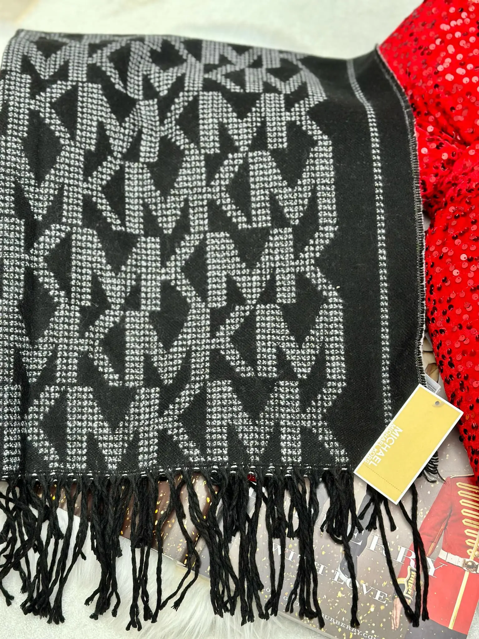 Žiemiškas Michael Kors firmos šalikas su kutais – jaukus ir šiltas aksesuaras vėsiems orams. Aukštos kokybės medžiaga užtikrina šilumą ir komfortą, o stilingas dizainas su prekės ženklo akcentais suteikia modernumo ir išskirtinumo jūsų įvaizdžiui.